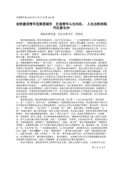 署名文章:2023.04.17湖南省委常委、长沙市委书记吴桂英:加快建设青年发展型城市打造青年心生向往、人生出彩的现代化新长沙