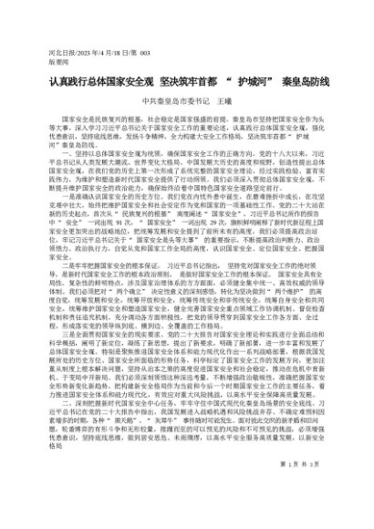 / 署名文章:2023.04.18中共秦皇岛市委书记王曦:认真践行总体国家安全观坚决筑牢首都护城河秦皇岛防线