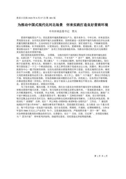 / 署名文章:2023.04.17中共怀来县委书记贾兵:为推动中国式现代化河北场景怀来实践打造良好营商环境