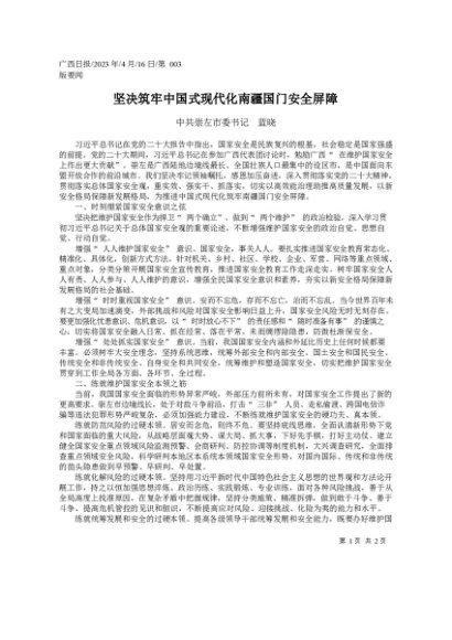 署名文章:2023.04.16中共崇左市委书记蓝晓:坚决筑牢中国式现代化南疆国门安全屏障