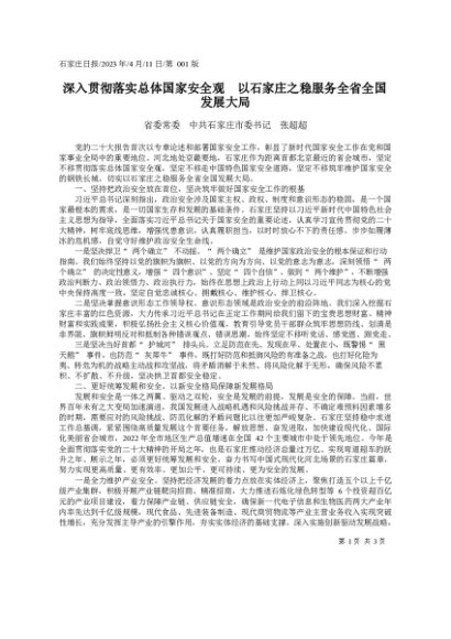 署名文章:2023.04.11省委常委中共石家庄市委书记张超超:深入贯彻落实总体国家安全观以石家庄之稳服务全省全国发展大局