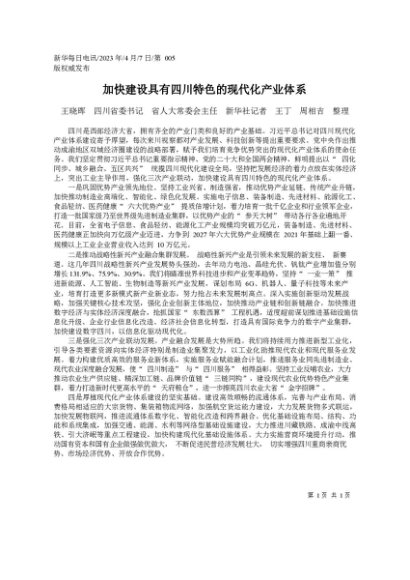 署名文章:2023.04.07王晓晖四川省委书记省人大常委会主任新华社记者王丁周相吉整理:加快建设具有四川特色的现代化产业体系