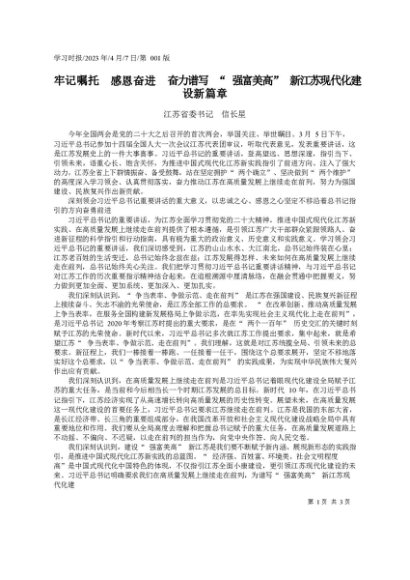/ 署名文章:2023.04.07江苏省委书记信长星:牢记嘱托感恩奋进奋力谱写强富美高新江苏现代化建设新篇章