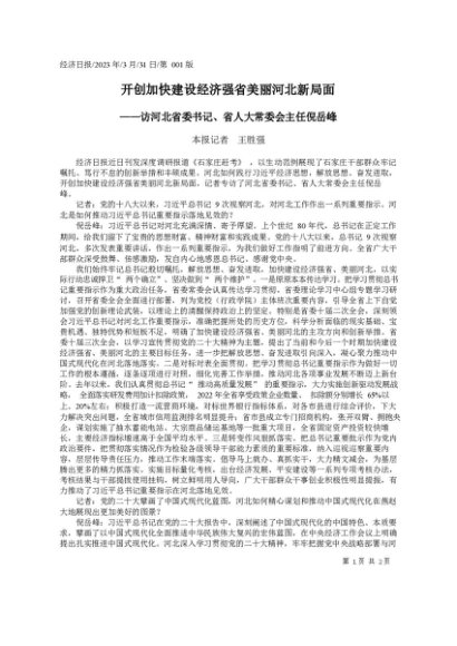 / 署名文章:2023.03.31本报记者王胜强:开创加快建设经济强省美丽河北新局面