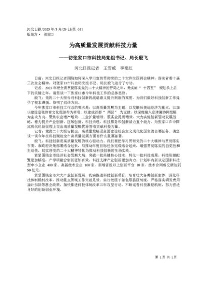 / 署名文章:2023.03.29河北日报记者王雪威李艳红:为高质量发展贡献科技力量