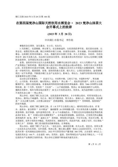 署名文章:2023.03.29中共铜仁市委书记李作勋:在第四届梵净山国际天然饮用水博览会·2023梵净山抹茶大会开幕式上的致辞