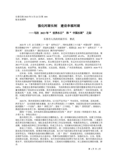 署名文章:2023.03.22长春市人民政府副市长曹武:强化河湖长制建设幸福河湖