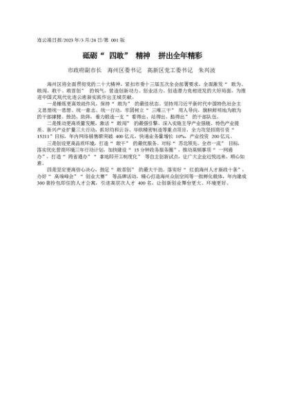 署名文章:2023.03.24市政府副市长海州区委书记高新区党工委书记朱兴波:砥砺四敢精神拼出全年精彩