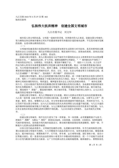 署名文章:2023.03.27九江市委书记刘文华:弘扬伟大抗洪精神创建全国文明城市