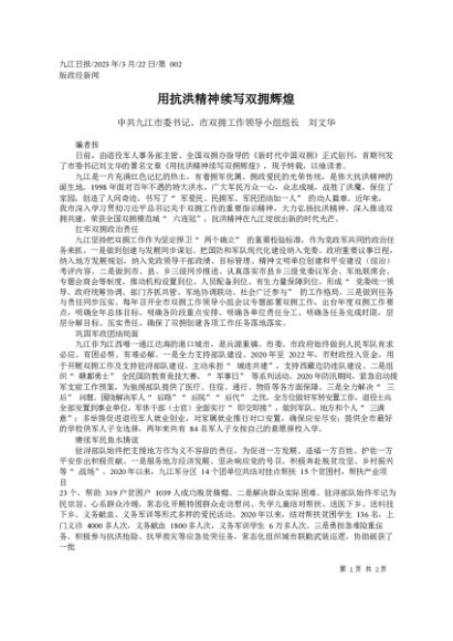 / 署名文章:2023.03.22中共九江市委书记、市双拥工作领导小组组长刘文华:用抗洪精神续写双拥辉煌
