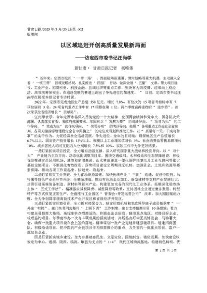 / 署名文章:2023.03.20新甘肃·甘肃日报记者杨唯伟:以区域追赶开创高质量发展新局面