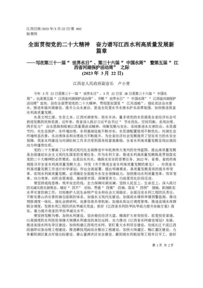 / 署名文章:2023.03.22江西省人民政府副省长卢小青:全面贯彻党的二十大精神奋力谱写江西水利高质量发展新篇章