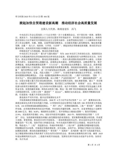 / 署名文章:2023.03.13全国人大代表、海南省省长冯飞:掀起加快自贸港建设新高潮推动经济社会高质量发展