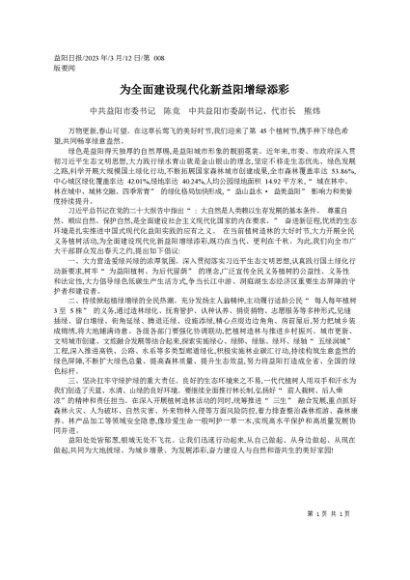 署名文章:2023.03.12中共益阳市委书记陈竞中共益阳市委副书记、代市长熊炜:为全面建设现代化新益阳增绿添彩