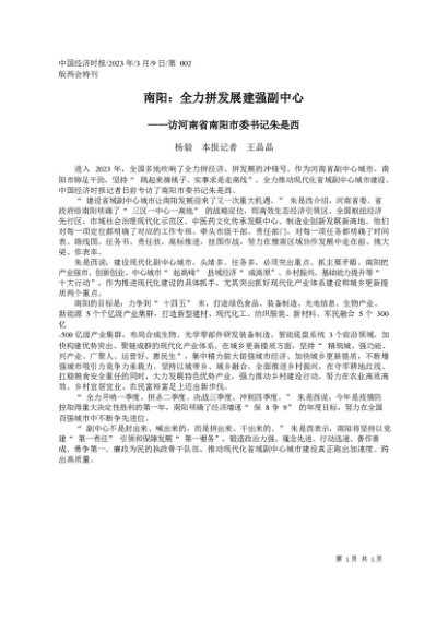 / 署名文章:2023.03.09杨毅本报记者王晶晶:南阳:全力拼发展建强副中心