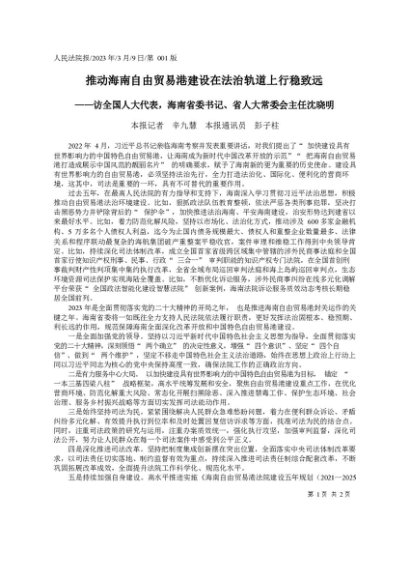 署名文章:2023.03.09本报记者辛九慧本报通讯员彭子柱:推动海南自由贸易港建设在法治轨道上行稳致远