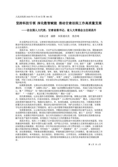 / 署名文章:2023.03.10本报记者潘静本报通讯员张彦峰:坚持科技引领深化数智赋能推动甘肃法院工作高质量发展