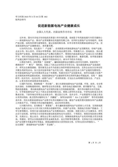 署名文章:2023.03.10全国人大代表、河南省焦作市市长李亦博:促进新能源电池产业健康成长