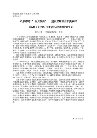 署名文章:2023.03.10农民日报·中国农网记者鲁明:扎实推进五大振兴建设宜居宜业和美乡村
