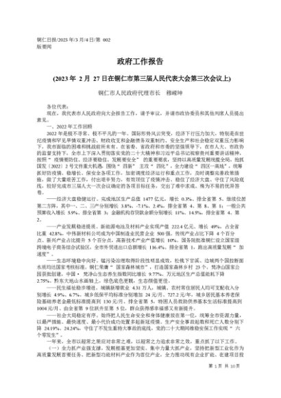 署名文章:2023.03.04铜仁市人民政府代理市长穆嵘坤:政府工作报告