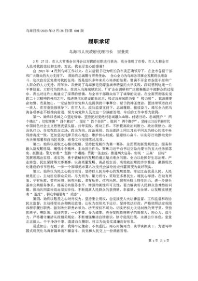 署名文章:2023.02.28乌海市人民政府代理市长崔景英:履职承诺