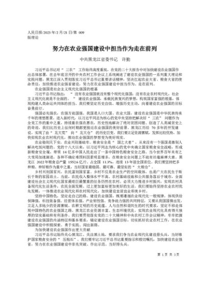 署名文章:2023.02.21中共黑龙江省委书记许勤:努力在农业强国建设中担当作为走在前列