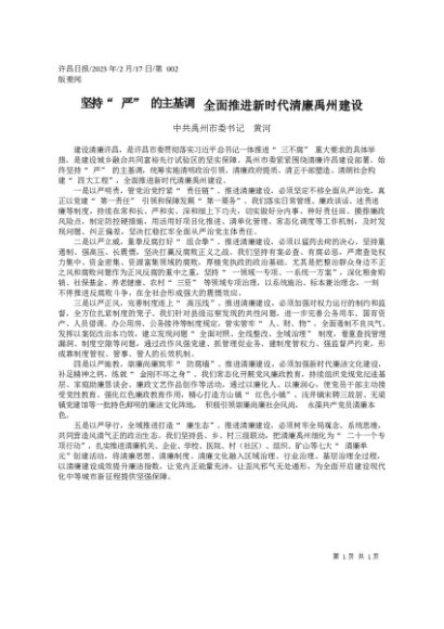 署名文章:2023.02.17中共禹州市委书记黄河:坚持严的主基调全面推进新时代清廉禹州建设