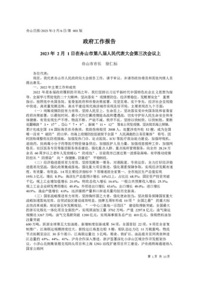 署名文章:2023.02.06舟山市市长徐仁标:政府工作报告
