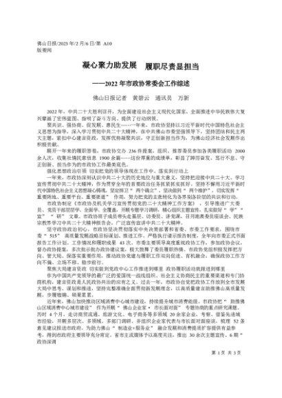 署名文章:2023.02.06佛山日报记者黄碧云通讯员万新:凝心聚力助发展履职尽责显担当