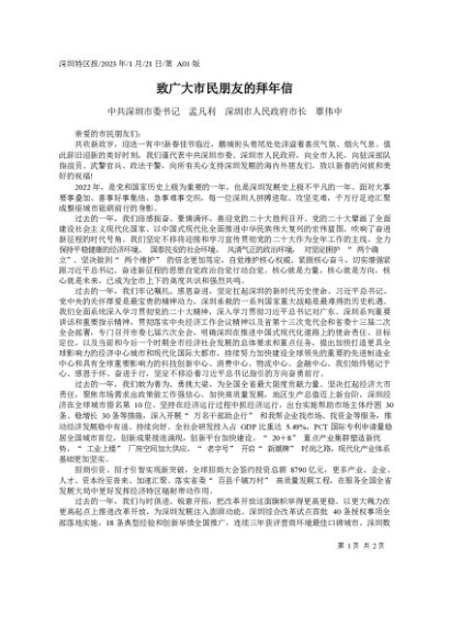 / 署名文章:2023.01.21中共深圳市委书记孟凡利深圳市人民政府市长覃伟中:致广大市民朋友的拜年信