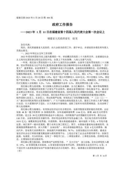 署名文章:2023.01.20福建省人民政府省长赵龙:政府工作报告