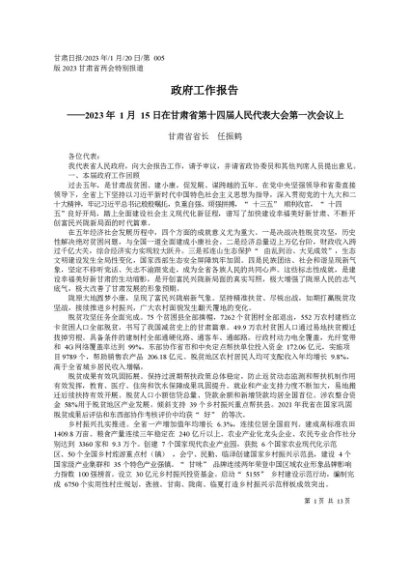 / 署名文章:2023.01.20甘肃省省长任振鹤:政府工作报告