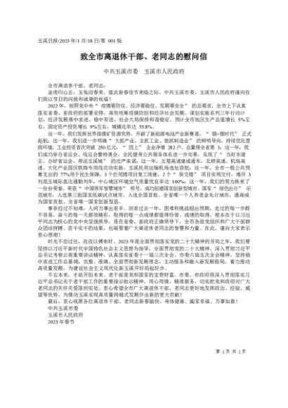 / 署名文章:2023.01.18中共玉溪市委玉溪市人民政府:致全市离退休干部、老同志的慰问信