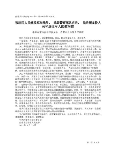 署名文章:2023.01.14中共内蒙古自治区委员会内蒙古自治区人民政府:致驻区人民解放军指战员、武装警察部队官兵、民兵预备役人员和退役军人的慰问信