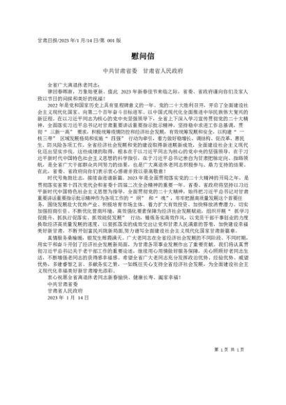 / 署名文章:2023.01.14中共甘肃省委甘肃省人民政府:慰问信