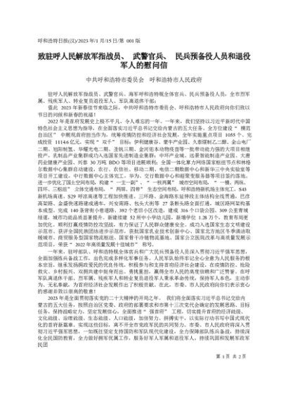 署名文章:2023.01.15中共呼和浩特市委员会呼和浩特市人民政府:致驻呼人民解放军指战员、武警官兵、民兵预备役人员和退役军人的慰问信