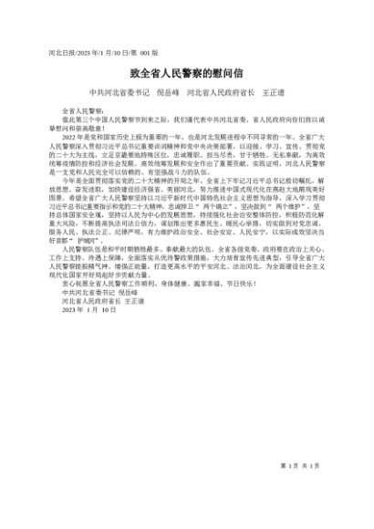 / 署名文章:2023.01.10中共河北省委书记倪岳峰河北省人民政府省长王正谱:致全省人民警察的慰问信