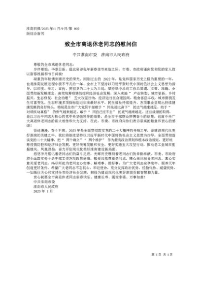 / 署名文章:2023.01.09中共淮南市委淮南市人民政府:致全市离退休老同志的慰问信