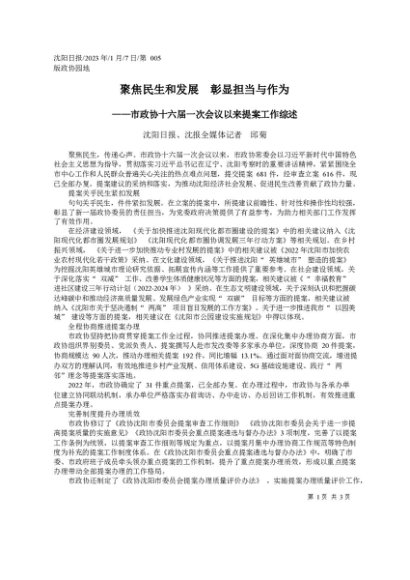 / 署名文章:2023.01.07沈阳日报、沈报全媒体记者邱菊:聚焦民生和发展彰显担当与作为