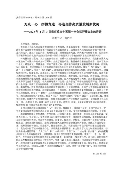 / 署名文章:2023.01.04市委书记葛巧红:万众一心拼搏竞进再造焦作高质量发展新优势