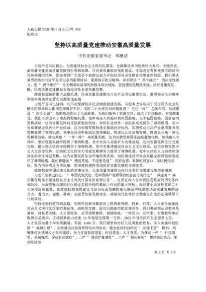 署名文章:2023.01.06中共安徽省委书记郑栅洁:坚持以高质量党建推动安徽高质量发展