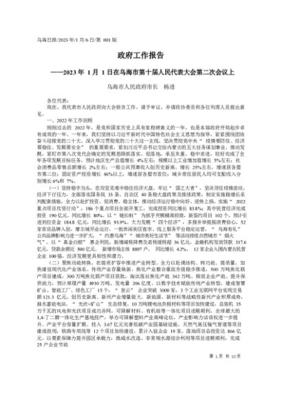 / 署名文章:2023.01.06乌海市人民政府市长杨进:政府工作报告