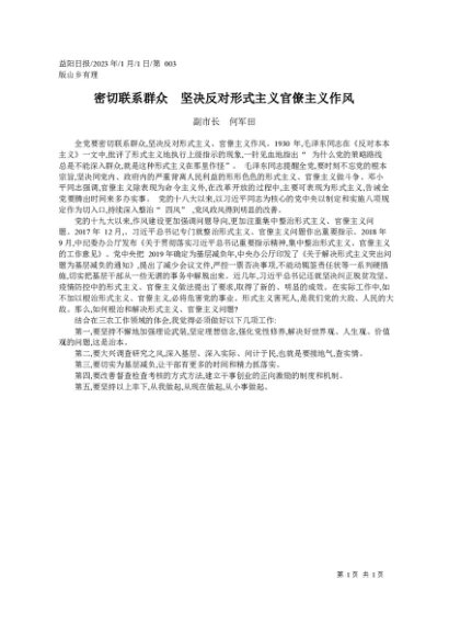 / 署名文章:2023.01.01副市长何军田:密切联系群众坚决反对形式主义官僚主义作风