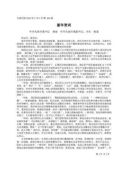 / 署名文章:2023.01.01中共乌海市委书记唐毅中共乌海市委副书记、市长杨进:新年贺词