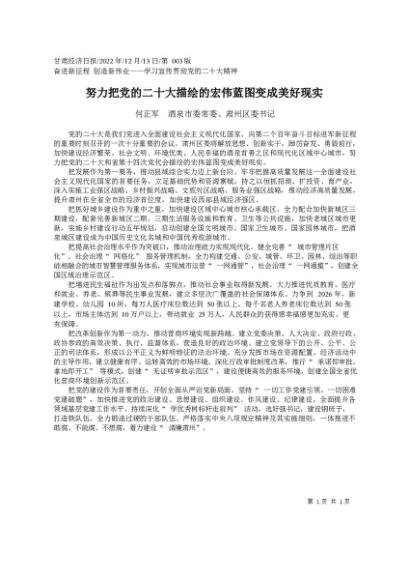 署名文章:2022.12.13何正军酒泉市委常委、肃州区委书记:努力把党的二十大描绘的宏伟蓝图变成美好现实