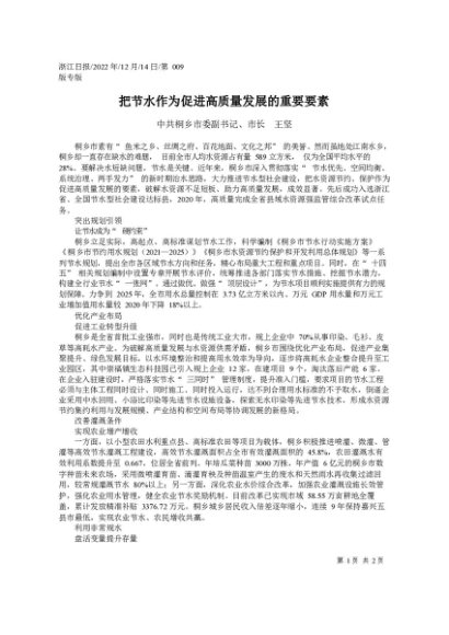 / 署名文章:2022.12.14中共桐乡市委副书记、市长王坚:把节水作为促进高质量发展的重要要素