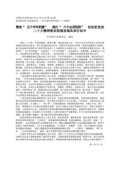 署名文章:2022.12.13中共皋兰县委书记康石:聚焦五个牢牢把握践行六个必须坚持切实把党的二十大精神落实到强县域具体行动中