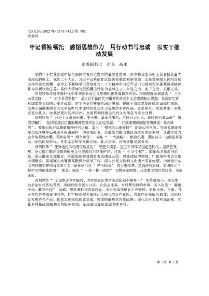 / 署名文章:2022.12.14市委副书记市长高永:牢记领袖嘱托感悟思想伟力用行动书写忠诚以实干推动发展