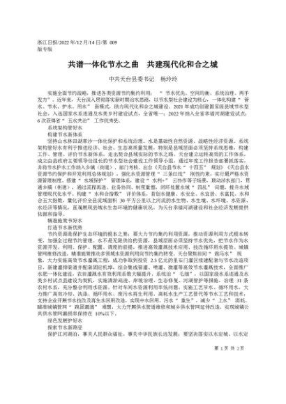 / 署名文章:2022.12.14中共天台县委书记杨玲玲:共谱一体化节水之曲共建现代化和合之城