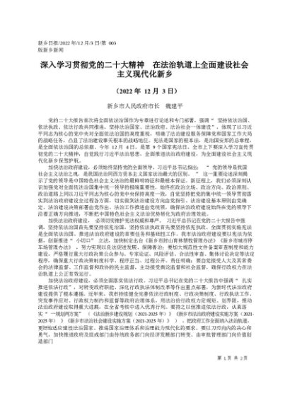 / 署名文章:2022.12.03新乡市人民政府市长魏建平:深入学习贯彻党的二十大精神在法治轨道上全面建设社会主义现代化新乡